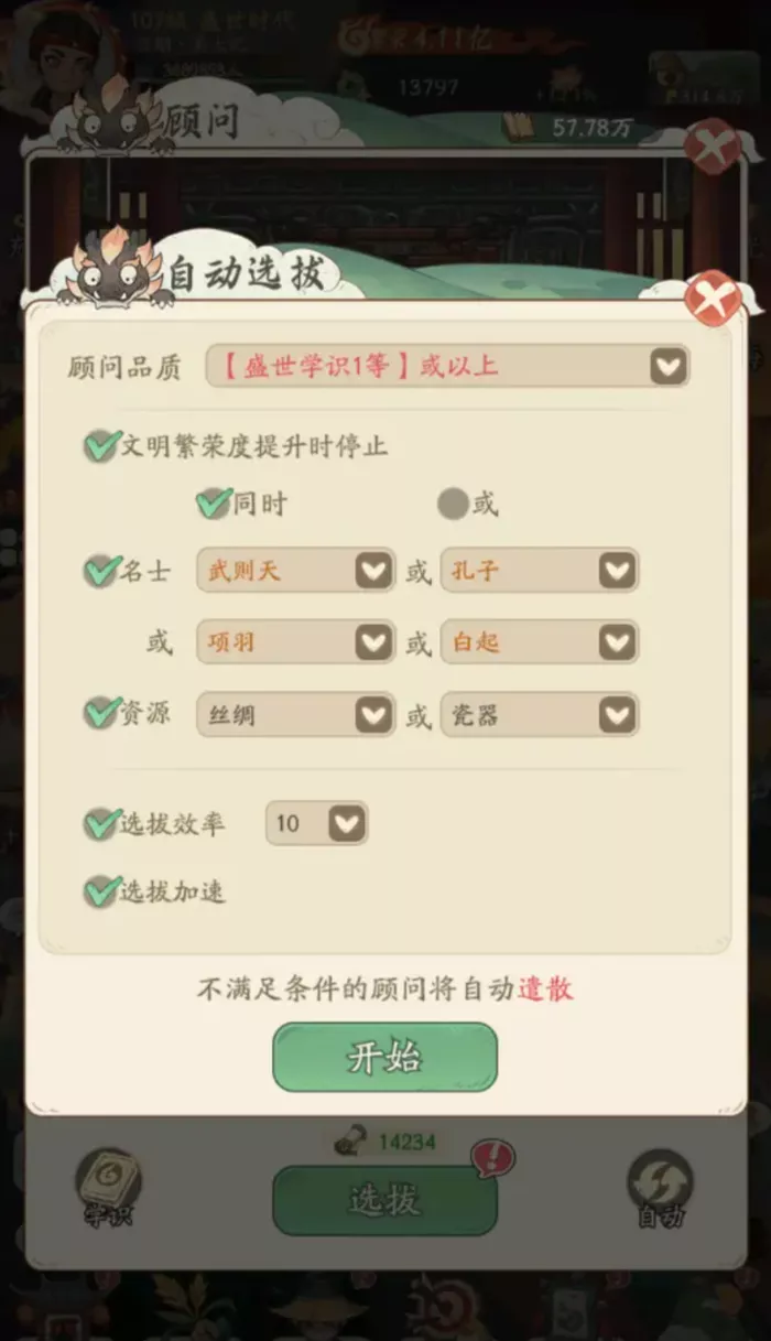 另外名士类的顾问在选取的时候主要是玩家队伍当中的主力名士,这时候还是要根据具体的类型跟特点,选取相对应的属性加成类的顾问。如果玩家真的不知道该如何操作的话,就直接采用游戏当中自动筛选的功能。
