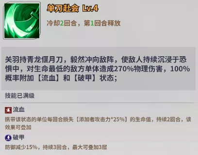 致尊敬的调查员,无双英雄【关羽】是冒险旅途中一名强而有力的战将。关羽有着极为优秀的输出性能,技能伤害不凡的同时可行挂风系的流血状态;自身可行附加破甲效果,增加队伍的输出上限;击杀回血机制更是为自身给予了一定的续航能力。所以在配队方面更加宽泛,不会有特殊的机制限制,尽可能将输出最大化就是唯一方向。