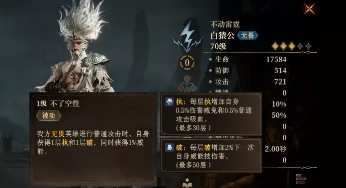 很多玩家可能会把这点给理解成为伤害加了2次,但实际情况并非如此,其实只加了1次,这种独特的技能机制需要玩家们在利用过程中不断摸索和理解,才能更好地发挥出猴哥的实力,不了空性是他的被动技能,这一技能为大家获取的无畏英雄带来了诸多优势,当我方无畏英雄进行普通攻击时,自身冷能够得到1层执和1层破,还能获取1%的威能,猴哥对威能技能有着不俗的伤害和频率加成,这让他在游戏中具备了强大的输出能力。