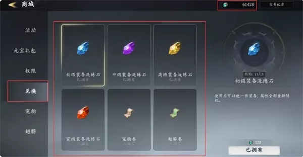 目前的兑换界面商品有初级到究极(蓝/紫/黄/红)洗练石和"宠物/翅膀"抽奖卷。