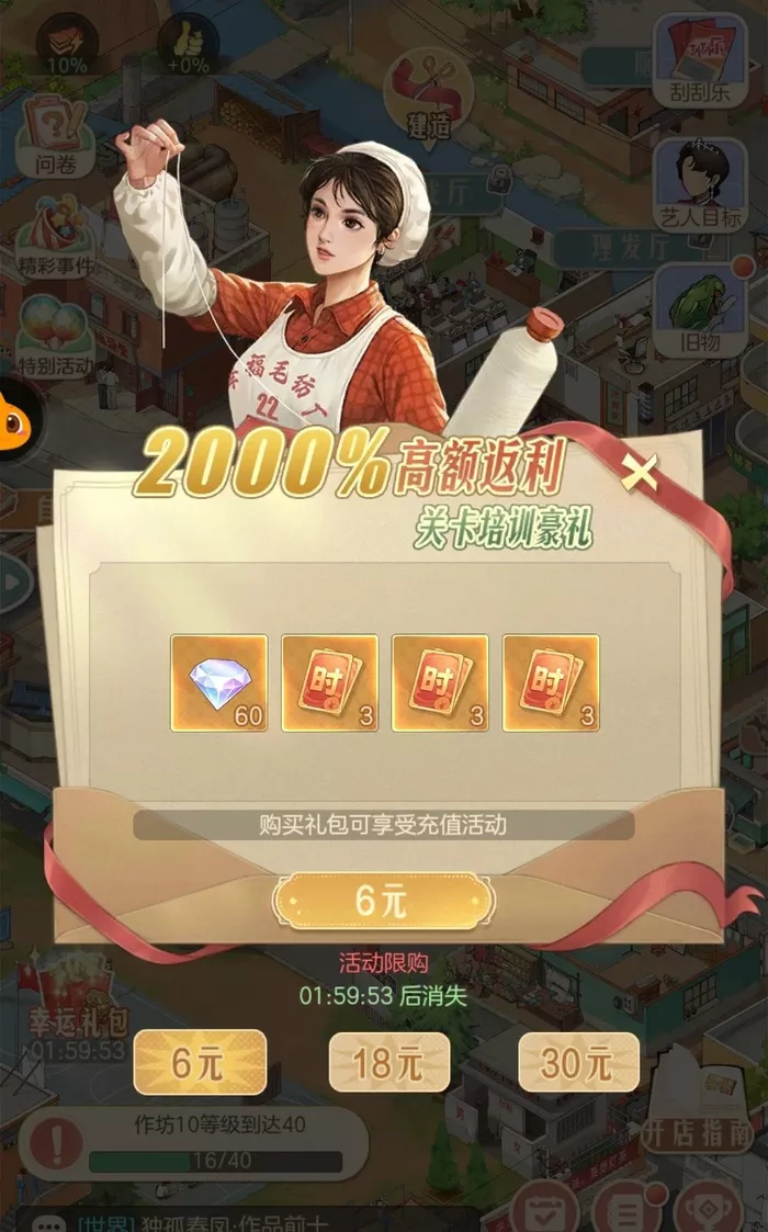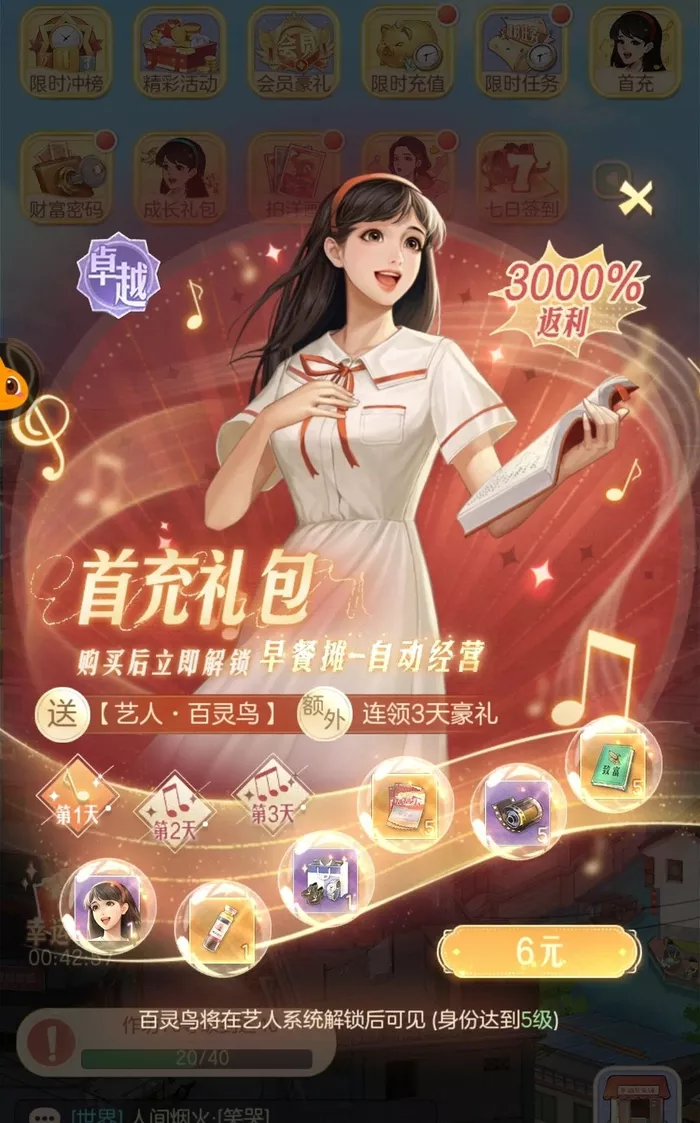 只想轻易体验的店长们,也可以花6元冲首充,首充可以取得一个特别重要的艺人【艺人-百灵鸟】,这个艺人对我们的前期发展很有益!当然,店长们也可以选取每天充值6元以触发推送礼包,持续取得连续充值礼包,享受稳步发展的乐趣,慢慢发展。