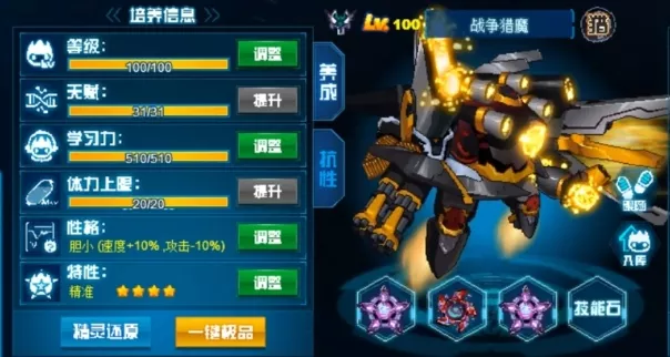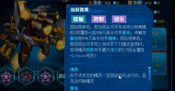 爆裂核能作为属性攻击,具有必中特性,并能在对手处于异常状态时强化状态翻倍,同时在紧接着的4回合内每回合吸取对手最大体力的三分之一,为战争猎魔给予了稳定的输出和续航能力,邪能机甲则能在4回合内免疫并反弹异常状态,受到攻击时有100%的几率使对手瘫痪,未触发则消除对手回合类效果,并使自身下2回合的攻击威力翻倍。