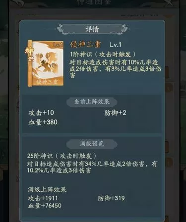 这套搭配当中核心就是法相天地 侵神三重了,法相天地的技能伤害虽然不算高,但是攻击之后是能够提高自身25%暴击以及30%爆伤的,这个加成还是非常强力的,是全游戏中为数不少能够增加暴击伤害的途径了,而侵神三重才是重头戏,这是暴击流玩家的毕业神识神通,效果就是造成伤害的时候,有10%的概率造成双倍伤害,还有3%的概率造成三倍伤害,如果运气好,在触发暴击的时候又触发了三倍伤害,那么是极有可能一个普攻就将敌方秒杀的,一共加成下来就是6-7倍的伤害,强度还是很高的。
