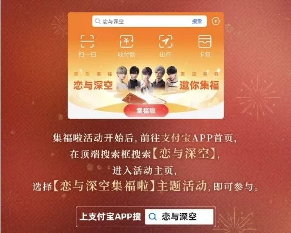 1、1月15日起,在支付宝早鸟活动中输入“恋与深空集福啦早鸟卡”口令。