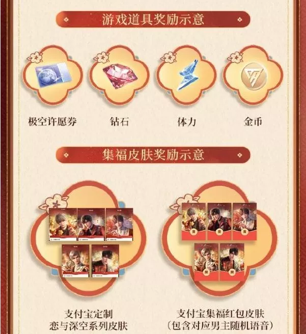 集齐五张福卡合成后,可获得极空许愿券、钻石、支付宝定制的恋与深空系列皮肤、支付宝集福红包皮肤(包含随机男主语音)奖励。
