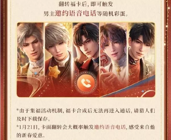 1、1月21日,卡面翻转时会大概率触发男主邀约语音电话。