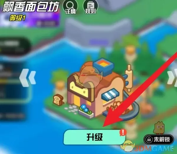 2、在飘香面包坊中,点击升级按钮,对这个面包坊进行升级;