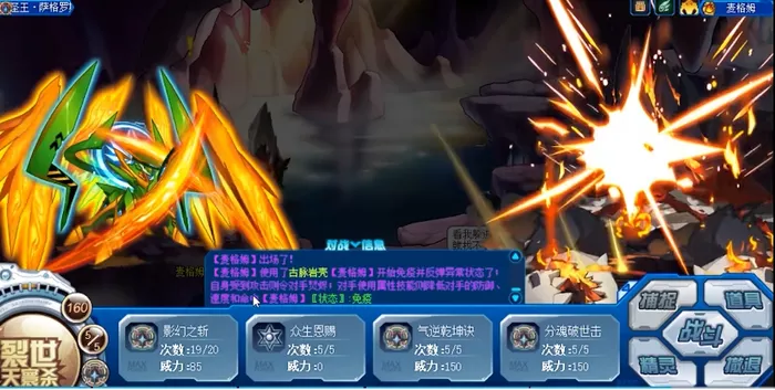 第三轮艾斯普鲁它拥有10000的血量,必定先手的能力让它十分难以对付,每次攻击不仅能消除大家的强化状态,还能使属性无效,并且让大家的精灵麻痹1-2回合,每回合还会吸取我方300血量,属性技能肆意雷鸣更有4回合吃月亮效果,对于这样的敌人,打法是用草王盾咤克斯引爆,如果艾斯普鲁强化了,就切八戒、魔花仙灵或索比斯送死肖强,然后再换上草王盾伊芙丽或伊芙利莎运用暗月守护歌进行强杀。