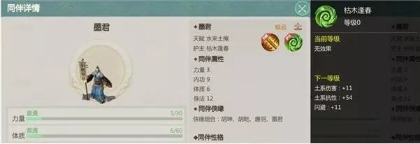 2、墨君的身法以及内功比较强,并且“枯木逢春”技能一定等级提升土系伤害。