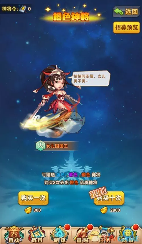 神将招募:这是一个属于土豪的活动,300元宝或神将令可参加招募抽奖1次。神将可分为:蓝、紫、橙等。抽10次以上,必出橙将;消耗2800元宝可连抽12次哦。不过新手玩家在早期领取游戏中奖励的元宝,就够一次十连抽的了,大家都可行体验的哦~