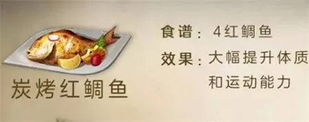 玩家在食用碳烤红鲷鱼后,可行大幅提升体制和运动能力,增加作战和续航效果。