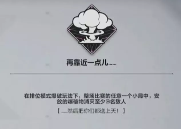 第三个隐藏成就“再靠近一点儿”:这个成就须要玩家在排位玩法中利用爆破物消灭三名以上的敌人。这考验的是玩家是否有判断战局的能力,是否可行摸透敌人的战斗路线,选择合适的地点安置爆破物。第四个“第六感”:须要玩家在排位玩法中,以视线受限的状态,完成击杀一名敌人的动作。这就很考验玩家的听脚步的功力和对地图的掌握了。