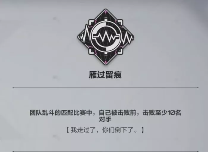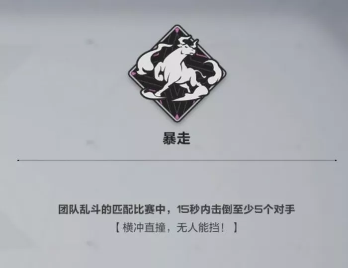 第一个“雁过留痕”:在乱斗大赛中要成功打败十名以上的敌人。想完成这个成就,玩家须要对自己的实力有十足的把握。选择自己擅长的枪械,再搭配上冷静的应对和快速的反击才能更好的得到成就。第二个“暴走”:这个成就还是挺有挑战难度的。玩家须要在乱斗比赛开始的十五秒以内,迅速打败五个敌人,这对于玩家的考验是相当大的。小编建议大胆一点,提前规划战斗路线,冲进敌人聚集的地方,趁敌人还未反应过来迅速完成收割。