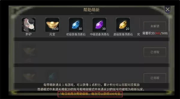 在打地狱模式的时候,顺便带上1个地狱模式没通关第10层的玩家,这样能把帮助萌新任务中的200元宝拿到手(带2场)。