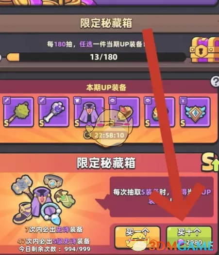 2、进去到商城页面能够看到多个选项,找到限定秘藏箱,点击买十个。
