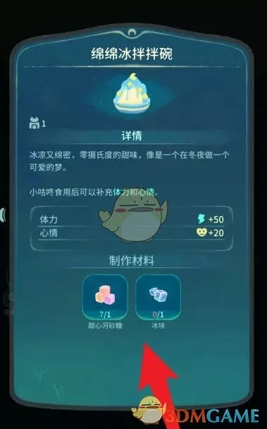 2、随后找到绵绵冰拌拌碗,查看制作原材料,收集砂糖和冰块;