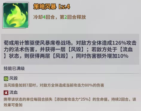 荀彧擅长造成群体伤害,并且能够附加流血效果;但要说荀彧的核心机制,自然是他独有的【风毁】,当累积到一定层数,允许对敌方全体造成伤害,使得荀彧在战局中更有效削减敌方群体的血线。