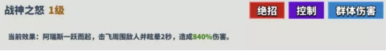 描述:阿瑞斯一跃而起,击飞周围敌人并眩晕2秒,造成840%伤害。