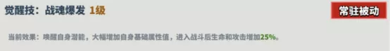 描述:唤醒自身潜能,大幅增加自身基础属性值,进入战斗后生命和攻击增加25%。