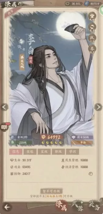 这边以李白为例,我们可行通过升级,升星,提高技能等级,提高职级等级,提高学识等级,武器,装备等来强化自己的角色,等级和职级尽量能拉满就拉满,一般都不会有太大问题,武器和装备优先提高自己的主c和前排的两个肉盾。
