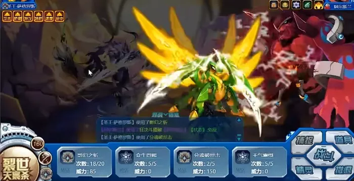 首先大家在打的时候先注意在第一个回合中,先派出两只具有四倍攻击力和先制攻击的精灵进行攻击,然后再用其他精灵进行补刀,第二个回合开始时,运用银翼极光技能将对手击倒,并让其自爆,跟着利用影蝠传承强化自身的能力,并发动高威力的王雷攻击,虽然不知道这样的伤害是否会翻倍,但即使没有翻倍也足够打败对手了。