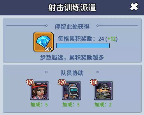 射击训练派遣,需要射击专精的队友——伐木工、超派(拥有射击专精的队友只要这两位,建议调配一位枪械专精的队友来到这里增强钻石的产出)