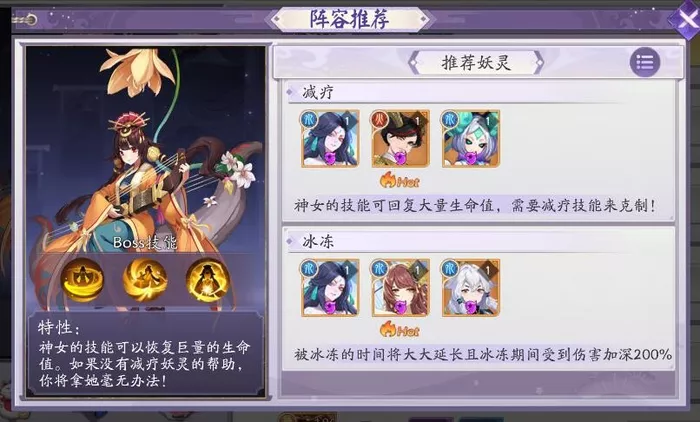 神女会不断回复自己的生命,所以需要我方妖灵有给神女上减疗debuff的能力,同时冰冻对神女也有特攻。所以推荐腾蛇,毕方,魔眼,洛神,河伯这些妖灵上阵。