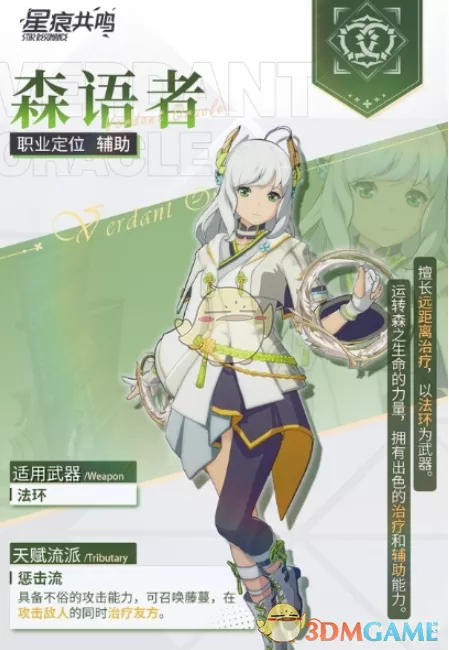 典型的辅助型职业,她们手中的法环就是施法工具,森语者允许选取惩击流或者愈合流作为自己的发展方向,前者让她们在保持一定治疗能力的同时具备了较强的攻击力,允许通过召唤缠绕植物等方式对敌人造成伤害并恢复友军生命值,后者则更加专注于提升整个小队的存活率,除了常规的治疗技能外,还能够施加各种增益buff,如增加移动速度、增强防御属性等。