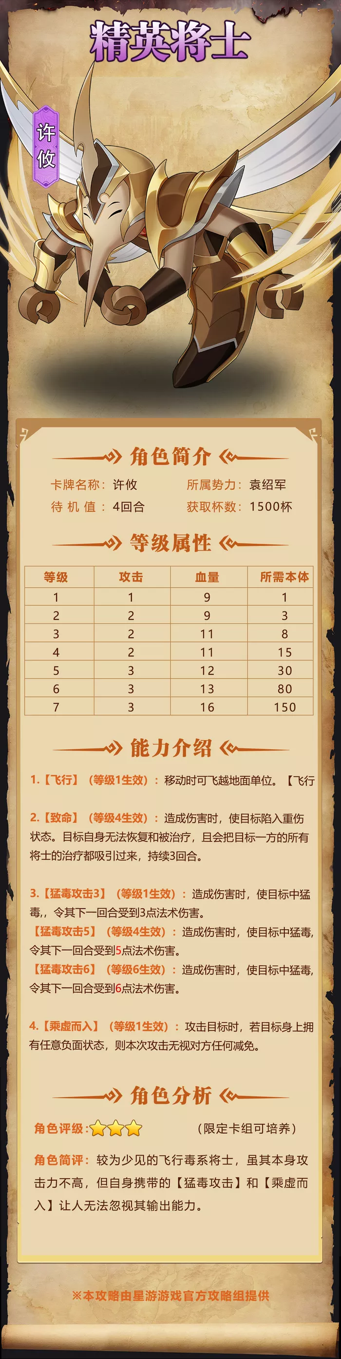 角色简评:较为少见的飞行毒系将士,虽其本身攻击力不高,但自身携带的[猛毒攻击]和[乘虚而入]让人不能忽视其输出能力。