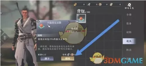 4、结尾在弹出的丹药页面,点击运用即可服用丹药得到特殊加成;