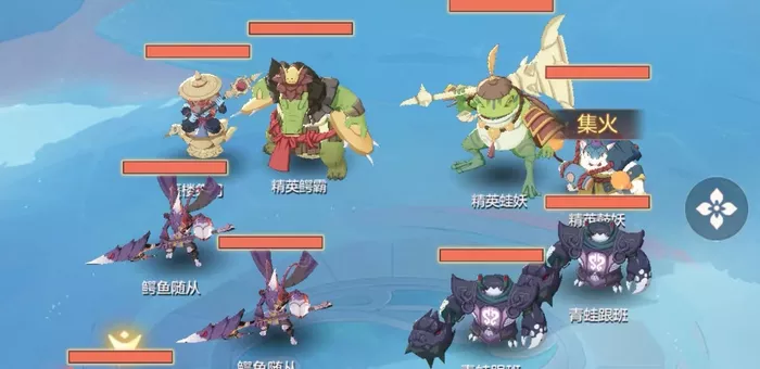 封系选取封印青蛙三人组其中一只,这里有两种打法:打法一是相对激进的打法,适合硬件条件较高的队伍,大部分输出集火精英鳄霸,压制其血线,少部分输出集火精英蛙妖。打法二是保守一点的打法,利用对方放完大招后的易伤迅速清掉小怪,这里选取分别集火两只鳄鱼随从,大概可行清掉2只,或者1残1死。