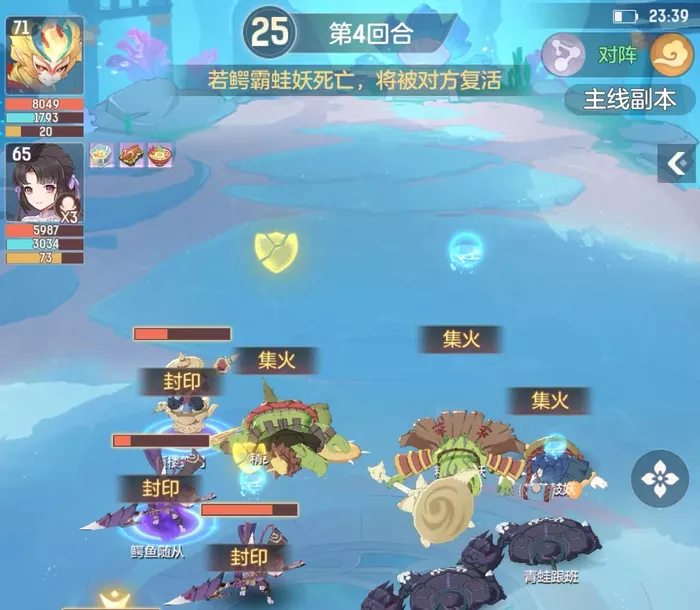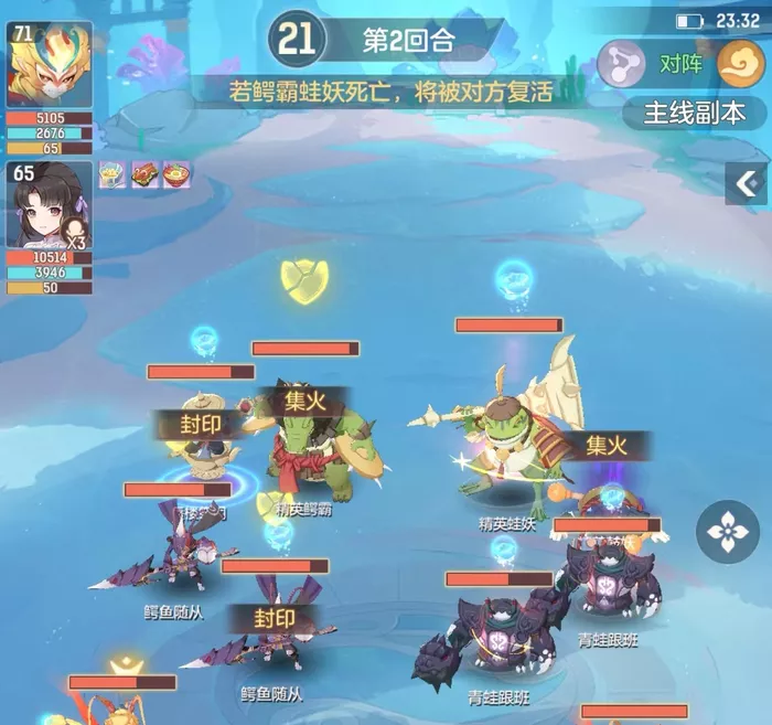 正常情况下对面蜃楼祭司被封,鼓妖倒地,左边鳄鱼三人组进入易伤状态。右边青蛙三人组准备释放高伤群攻。