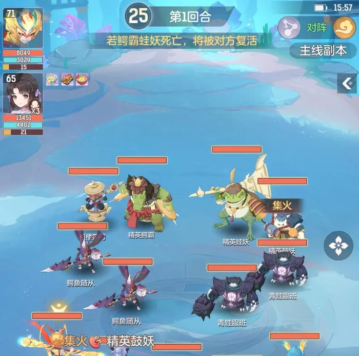 简单解释一下这么打的原因,因为一般野队对输出控制和指挥上都很粗略,这种打法能够兼顾容错率和通关速度。鼓妖第2回合会释放清水解封蜃楼祭司,并附加免封状态,因此要优先清掉。奶妈给被点名目标上金钟罩之后,左边的鳄鱼3人组大概只能造成累计3K左右的伤害,无伤大雅,反而右面的群秒输出较多,可行考虑用宝宝封掉。