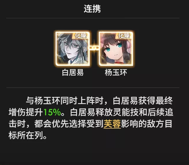 与杨玉环同时上阵时,白居易得到最终增伤提高15%。白居易释放灵能技和后续追击时,都会优先挑选受到芙蓉影响的敌方目标所在列。
