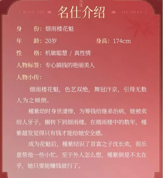 本期名仕录,让灵儿带各位大人回顾烟雨楼花魁——槿紫的故事吧~