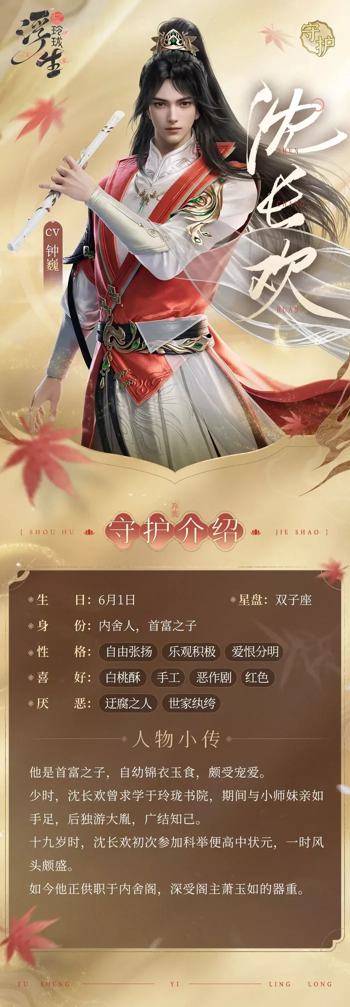 没有人知道像沈长欢这样养尊处优的公子之前经历了什么,不多玩家也都好奇。有关沈长欢的故事都在游戏的主线剧情和个人守护以及其他的各个支线里,喜欢的小伙伴记得探索。