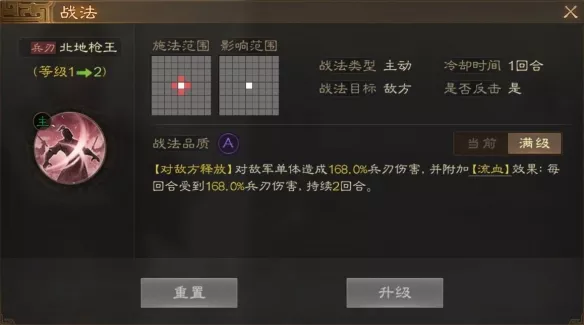 [对敌方释放]对敌军单体造成168. 0%兵刀伤害。并附加[沈血]效果:每回合受到168.0%兵刀伤害,持续2回舍。