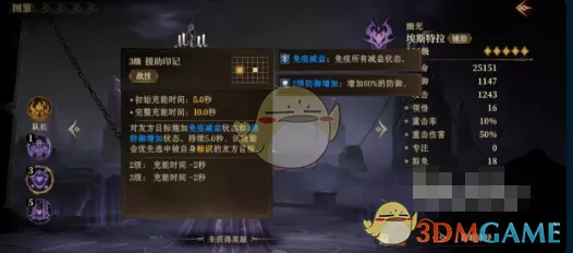被动技能摇曳烛光,战斗开始时将生命值最低的友方目标标识出来,使其拿到所有治疗和护盾效果增加。战技是援助印记,对友方目标施加免疫减益状态和防御增加状态,持续5秒钟,该技能会优先选择被标识的友方目标生效。免疫减益可以使对方免疫所有的减益状态,附加的防御增加为二级效果,增加60%防御。威能技为防护领域,持续施法6秒钟,在这期间,每0.2秒就能对生命值百分比最低的两个友方目标进行治疗。