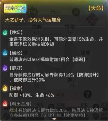 对于禅修弟子的选取,总而言之就是天命效果带有禅心,天赋是浩然正气和慧眼识珠,怪癖是迷糊的逆天禅修弟子潜力是最高的,其作用甚至超过了元润,以后我们允许根据其灵根选取相应的功法和法宝使其发挥出更大的效用。