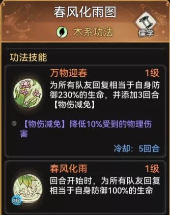 我们允许给元润配上春风化雨图和木灵医典功法,增加自己坦度的同时极大提升全体队友的保护能力