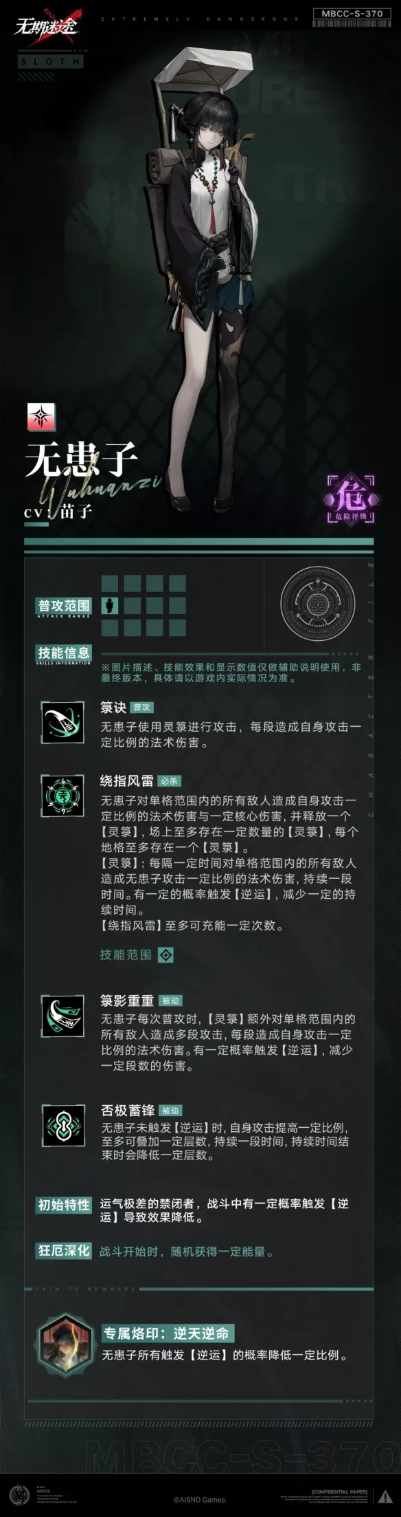 【灵箓】:每隔一定时间对单格范围内的所有敌人造成无患子攻击一定比例的法术伤害,持续一段时间。有一定的概率触发【逆运】,减少一定的持续时间。