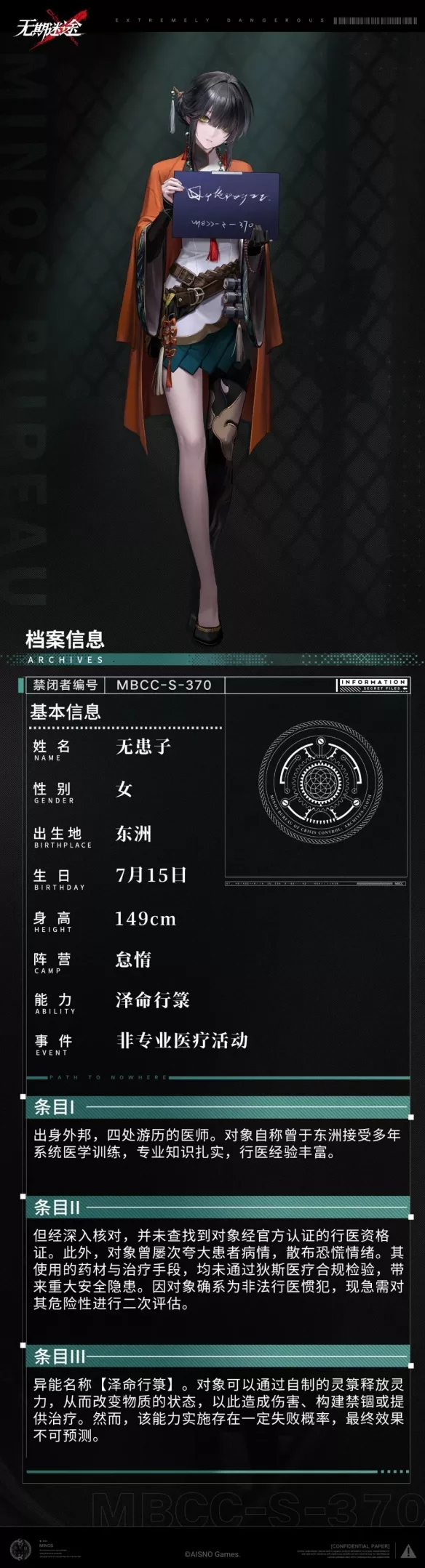 *条目I:出身外邦,四处游历的医师。对象自称曾于东洲接受多年系统医学训练,专业知识扎实,行医经验丰富。